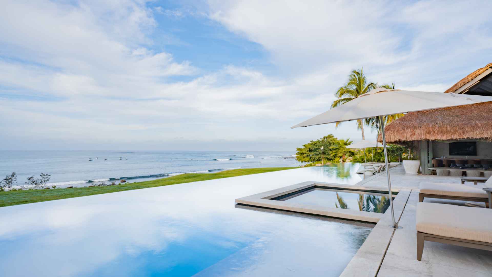 Outdoors, a poolside palapa with dining for 20 and rooftop lounge with panoramic ocean views make it easy to gather for cocktails or sunset dinners. Whether relaxing by the infinity pool or enjoying an evening under the stars, the experience embodies the best of Punta Mita oceanfront living.