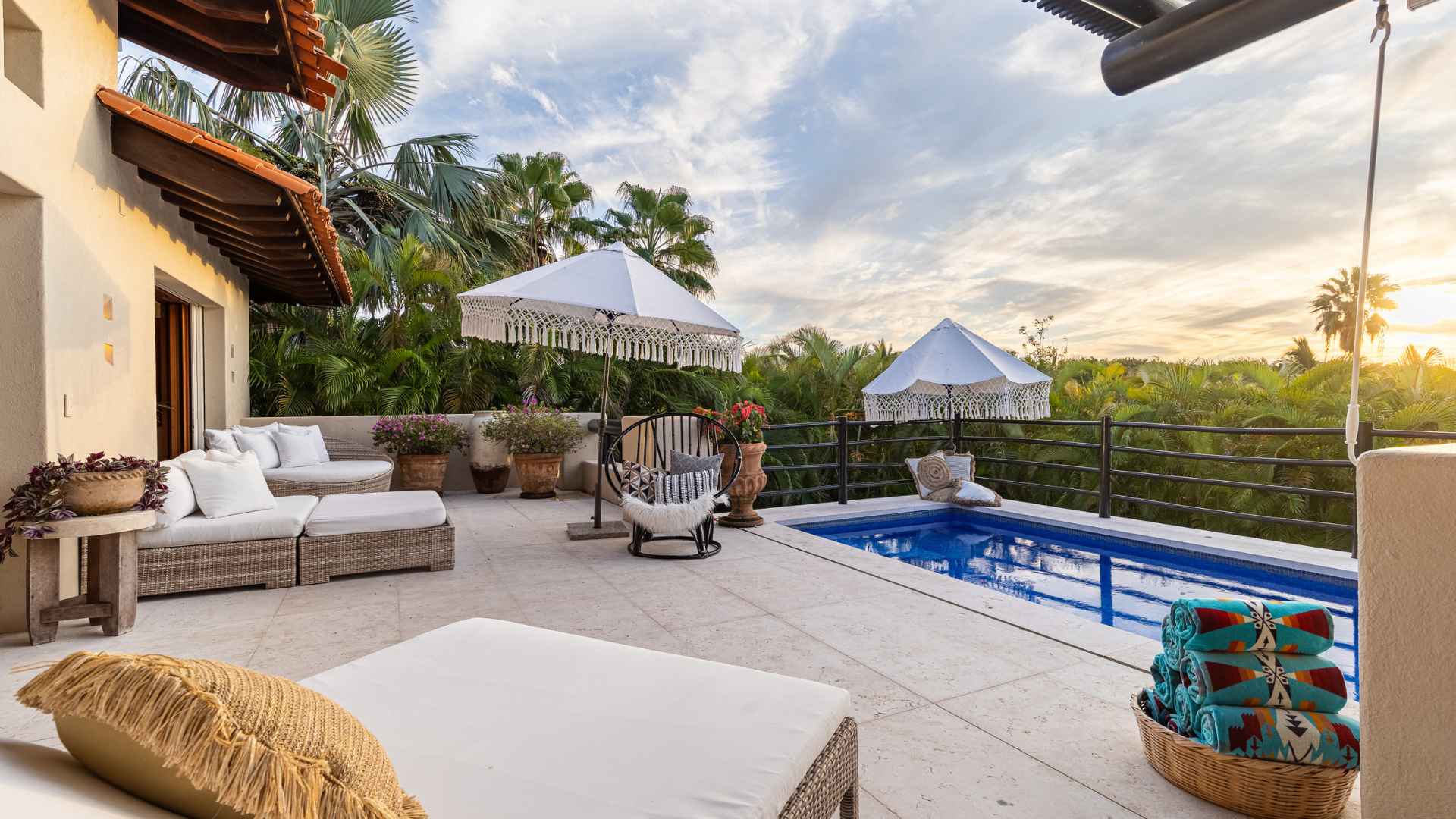 Enjoy outdoor dining for 12, a gas grill, granite serving area, and a plunge pool with sunset views. Each of the four large bedrooms features its own outdoor sitting area or patio, with two lower-level bedrooms opening to a private yard. Relax in the large TV den with a 70" Smart TV, and enjoy amenities like a UV drinking water system and private 24-hour security. Just a 2-minute walk or golf cart ride to the Pacifico Beach Club and a short ride to El Anclote village for local markets, shops, and excellent dining.