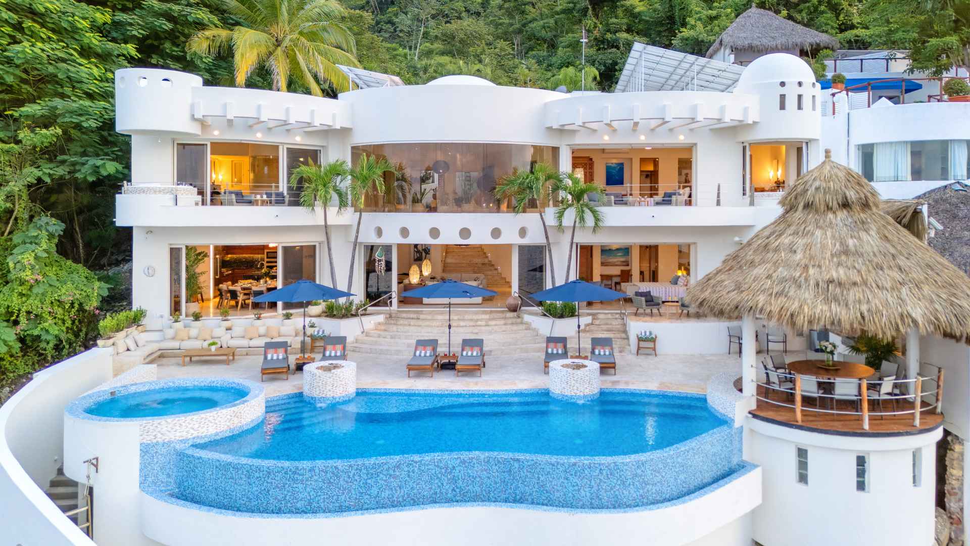 Casa Nahui is a luxurious five-bedroom villa located on the oceanfront, offering stunning views of the Los Arcos marine preserve and the lush mountains of Puerto Vallarta’s South Shore. Just 10 minutes from downtown, the villa accommodates up to 12 guests with three oceanfront master suites, each featuring a private Jacuzzi, ocean views, and a private terrace. Two additional bedrooms, set near tranquil bamboo gardens and waterfalls, offer garden views and en-suites.