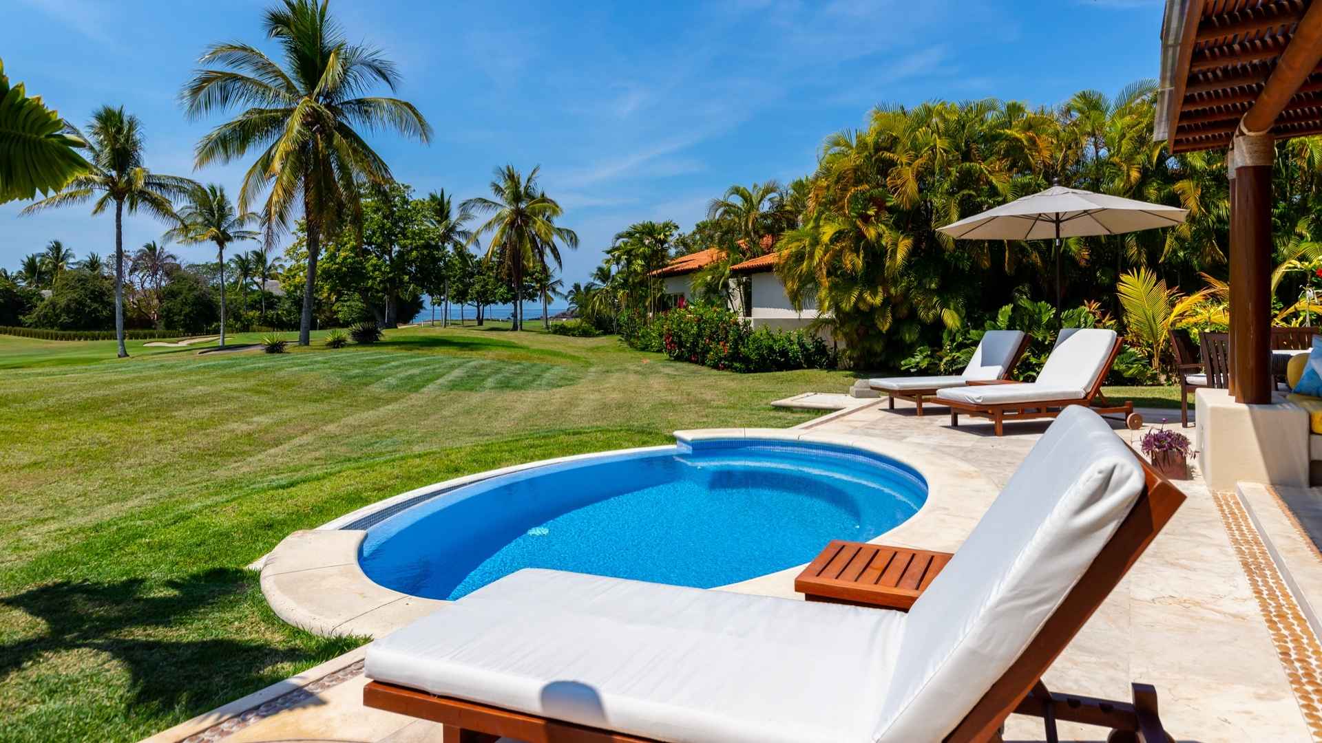 Las Palmas 5 is located in the Las Palmas community inside the gates of Punta Mita, Nayarit, Mexico. Centrally located with golf course views, guests will enjoy the large terrace, private plunge pool and all of the amenities that Punta Mita has to offer. Near the 2nd fairway of the Jack Nicklaus Signature Pacifico Golf course, where you can see the famous ‘Tail of the Whale’ island green, Las Palmas 5 embodies Punta Mita’s open-air lifestyle. Crafted as a single level, three-bedroom, three bath villa, it features golf course and partial ocean view and living/dining room that opens onto an expansive terrace with outdoor dining and your own plunge pool. Guests are just a 5-minute walk to the Pacifico Beach Club, which is only accessible by members.