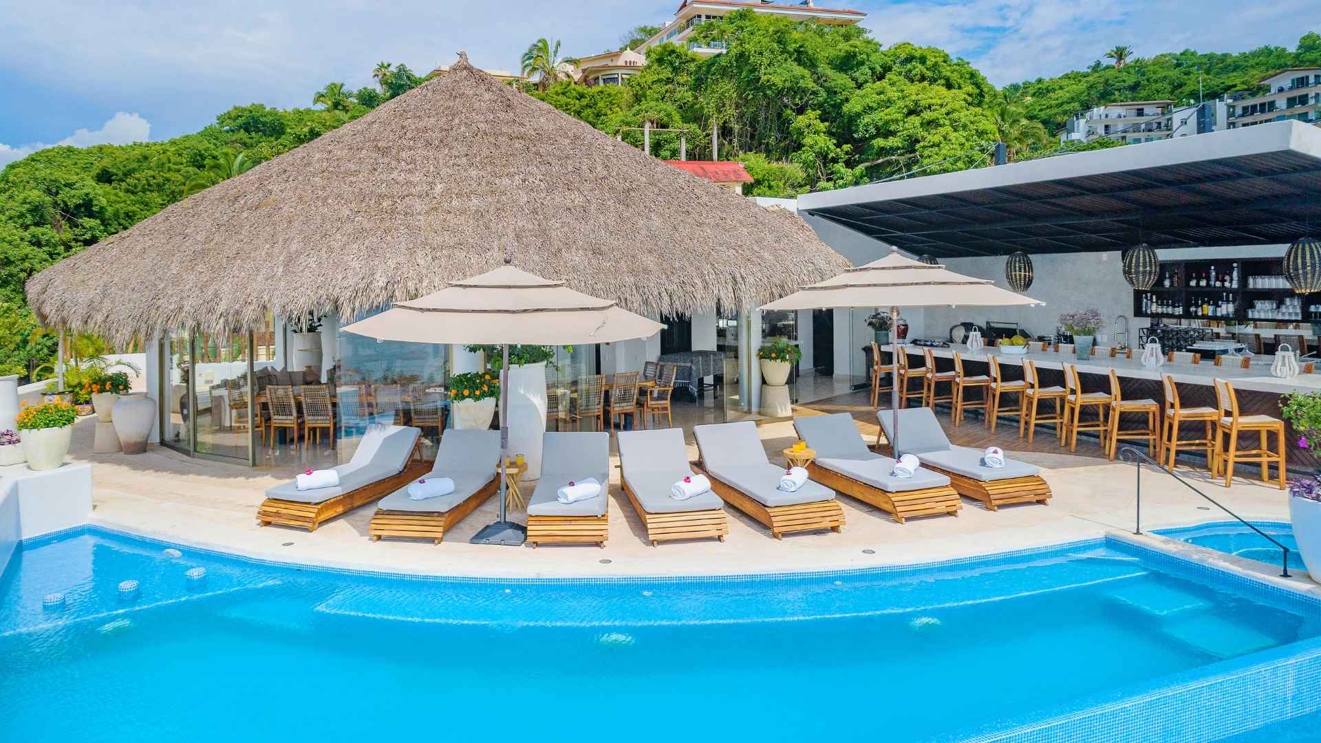 The home itself is very spacious, with grand common areas for guests to gather and enjoy each other's company! The Mixologist will serve you a Habanero Cucumber Margarita, which is the villas signature cocktail and is sure to delight your taste buds! The villas common areas include a large dining table with room for up to 22 guests, and a large outdoor wet bar – there is no shortage of comfortable lounge areas.